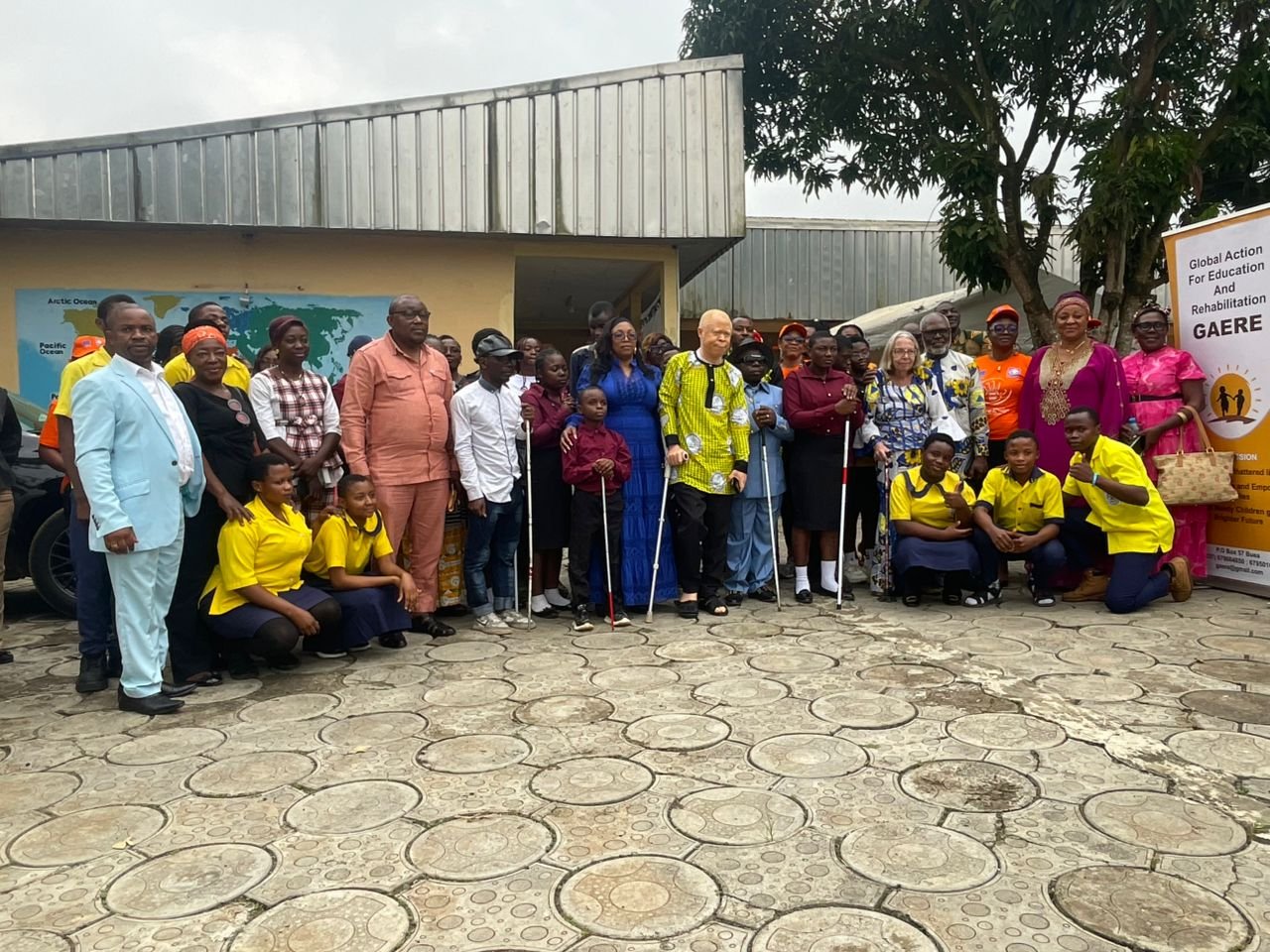 A group of persons pose for a photo. They are standing in front of the Buea School for the Deaf, where an event to launch week-long activities marking the International Day of Persons with Disabilities held.